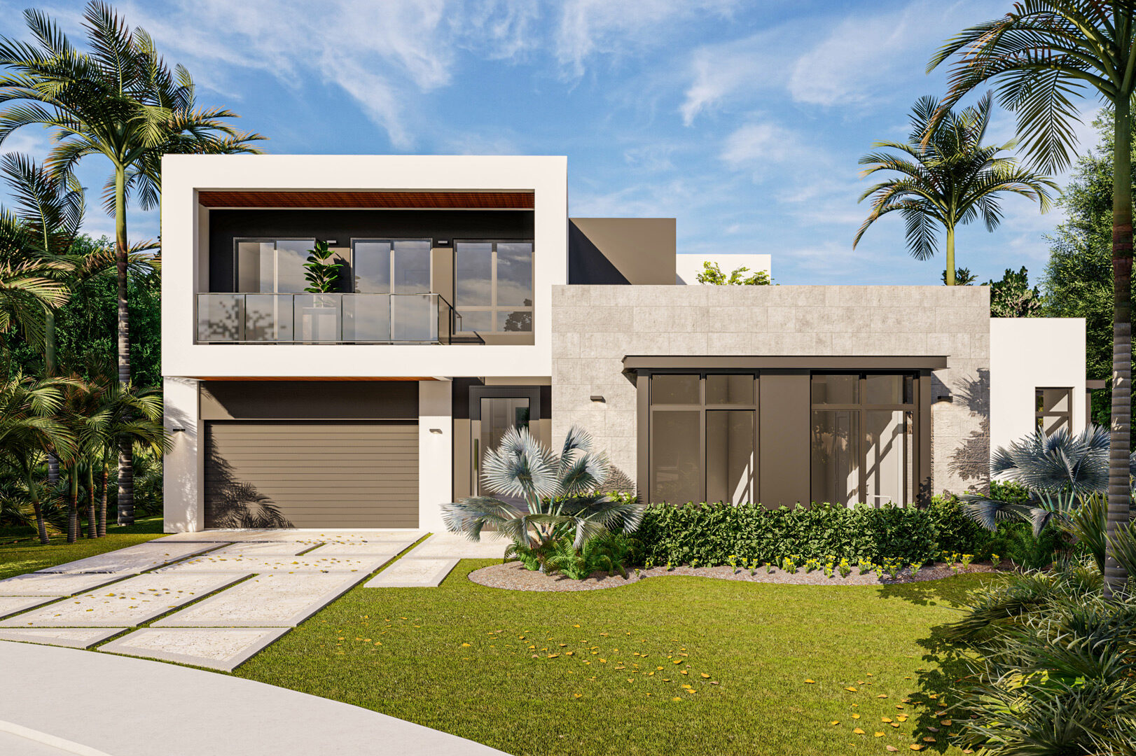 The residences boast striking exteriors with flat roofs and clean modern lines. From the distinctive turf-lined concrete paver driveways to the spacious backyards with large covered terraces, each home’s exterior creates a peaceful atmosphere. Large windows welcome soothing natural light into the residence, ensuring the tranquil ambiance stays with you as you make your way inside.